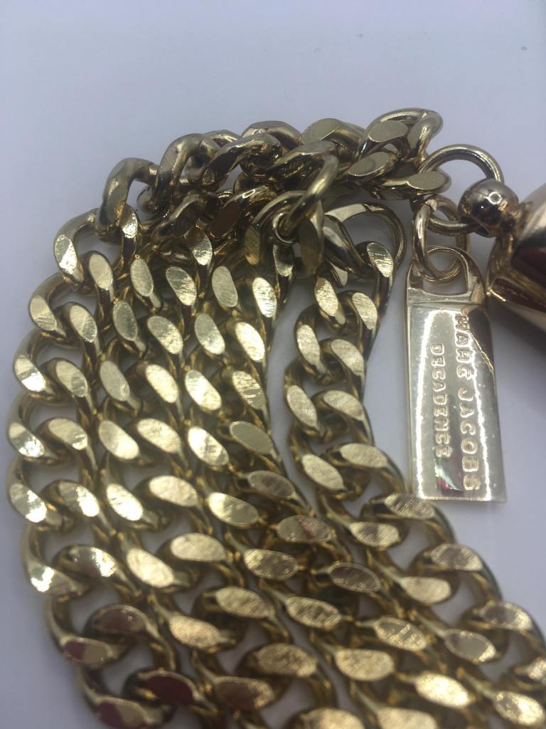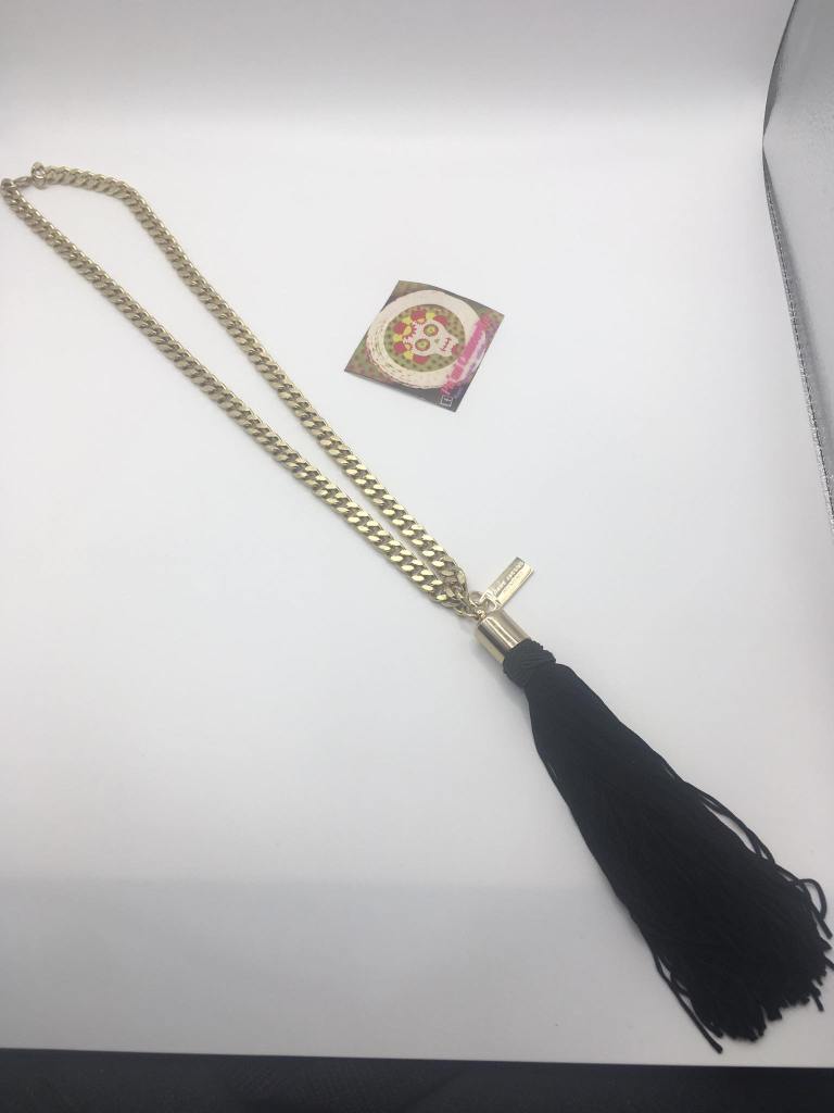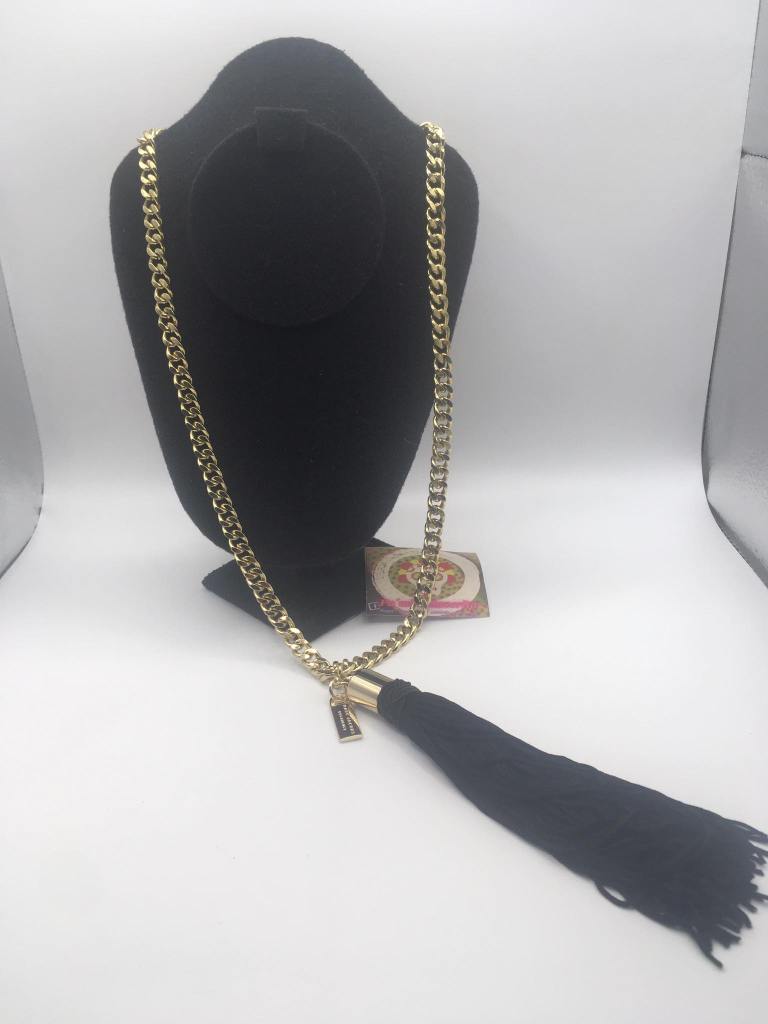 Collar de borlas de la colección «Decadence» del diseñador Marc Jacobs, La borla de seda negra cuelga de una importante cadena de eslabones dorados con su firma etiqueta colgante al frente, pinza de langosta de broche, mide 68 cm de largo. Excelente estado. https://tinyurl.com/24pe5v2y