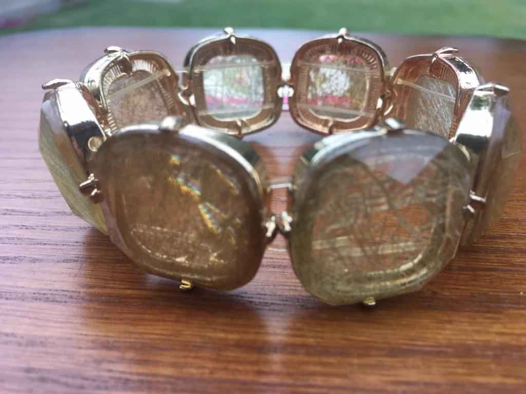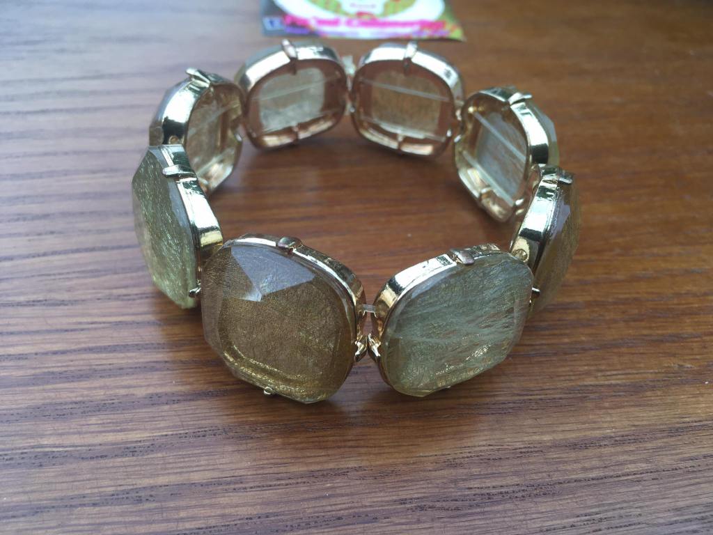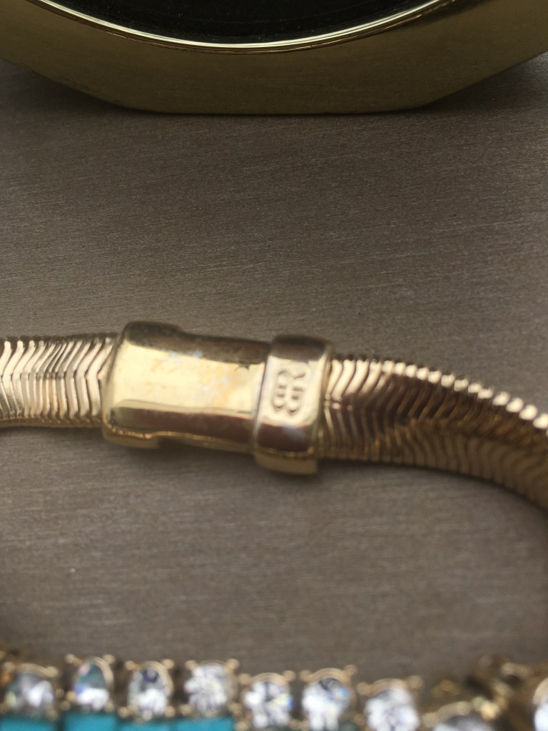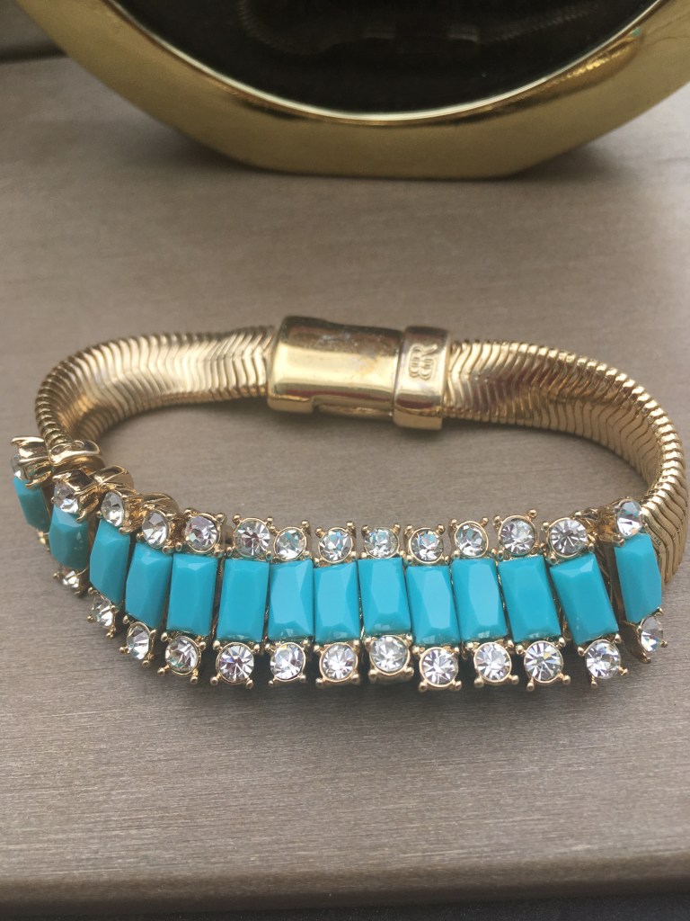 Firmado Banana Republic, bello brazalete acero color oro y charms de cuentas color Turquesa y cristales con cadena tejido cola de serpiente, con broche magnético en perfecto estado. Es una cadena flexible. Ideal para regalar.https://tinyurl.com/22555yuq
