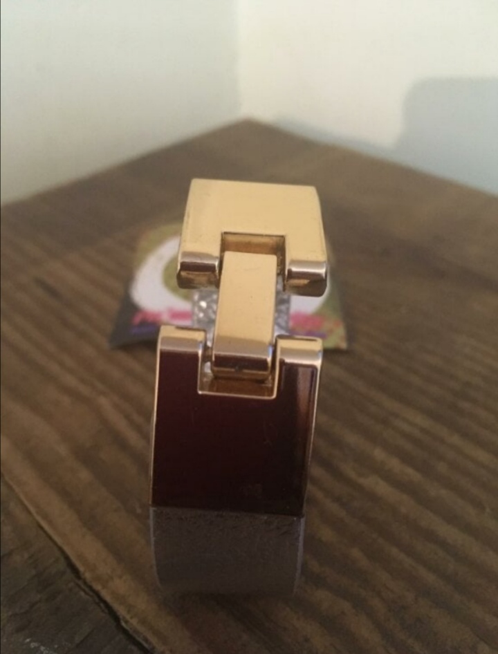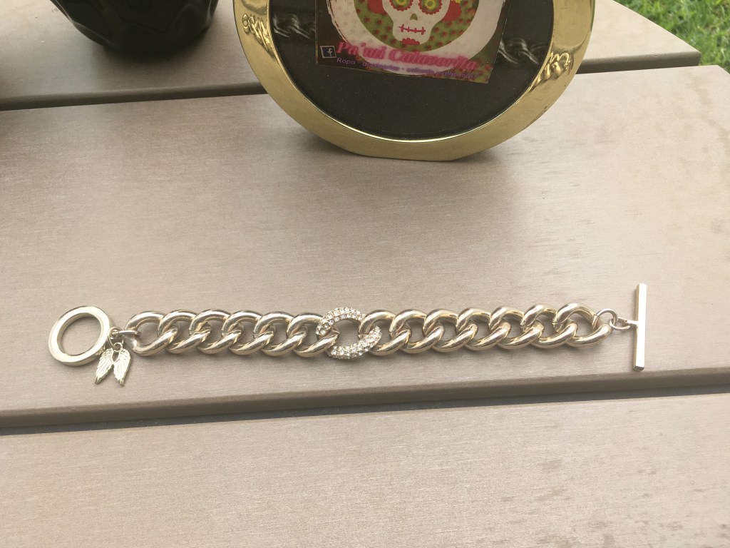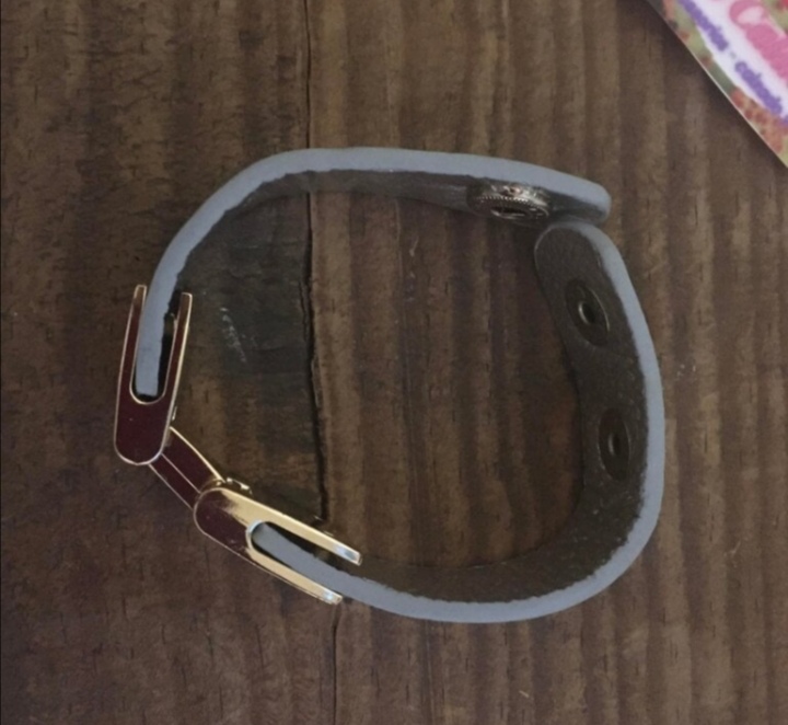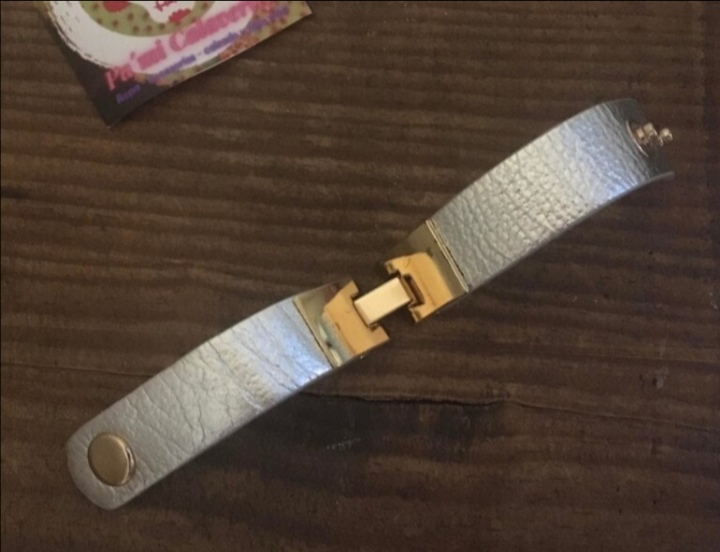 Lindo brazalete de piel en color plata con un adorno de metal al frente chapado en color oro, tipo hebilla, tiene dos botones de ajuste, realmente hermoso. Mide 21 cm. Marca YIK FUNG.